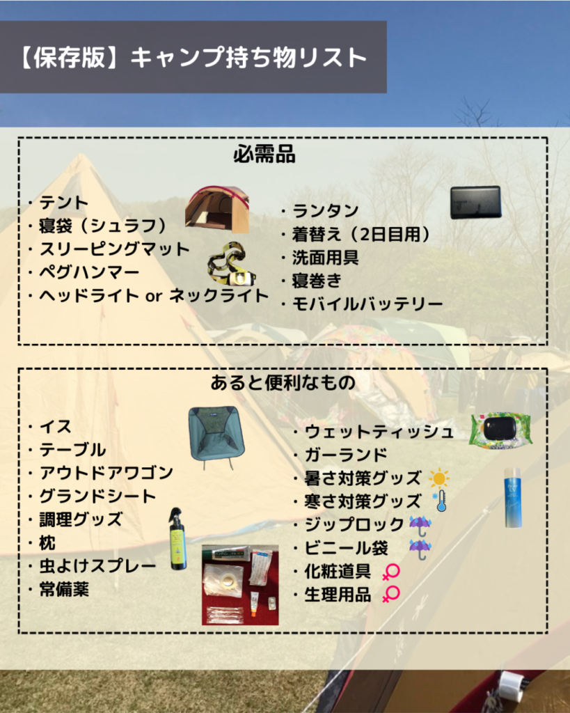 ▼図解:キャンプの持ち物リスト(必需品)