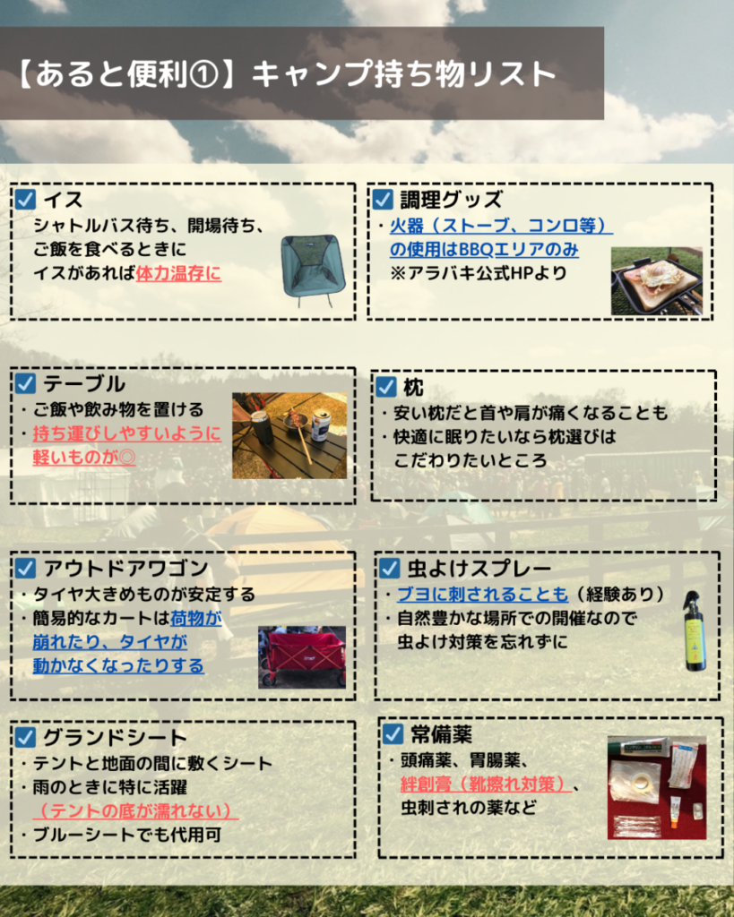 アラバキのルール(持ち込み禁止なもの)を確認しながら、わたしが実際に愛用しているアイテムを紹介しています。