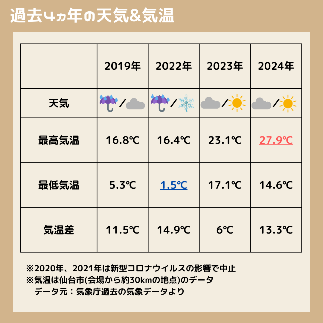 気温は開催年によって大きく変わり、日中半袖で過ごせるほど暖かいこともあります。
