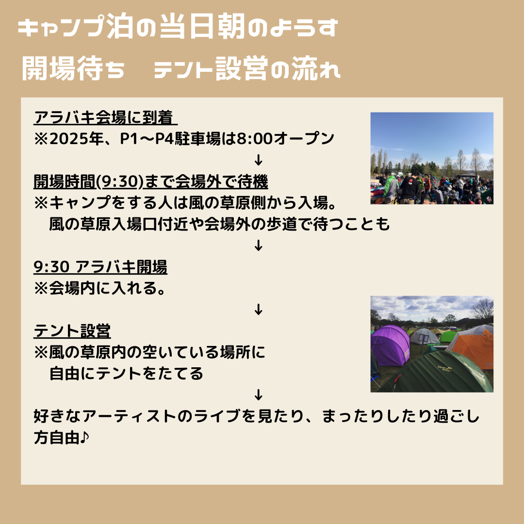 アラバキでのキャンプをしたことがない方にとっては、当日どんな感じなのか不安に思うかもしれません。